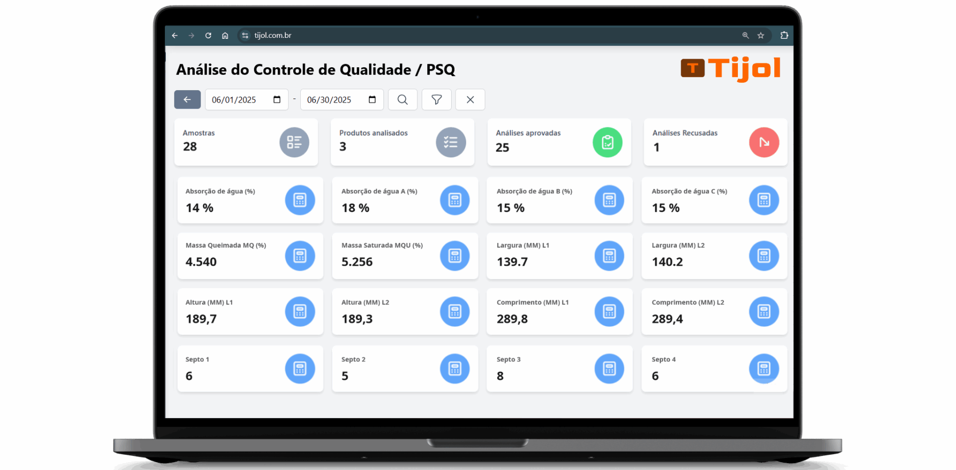 Indicadores gráficos que mostram cada resultado dos testes.